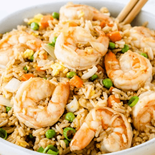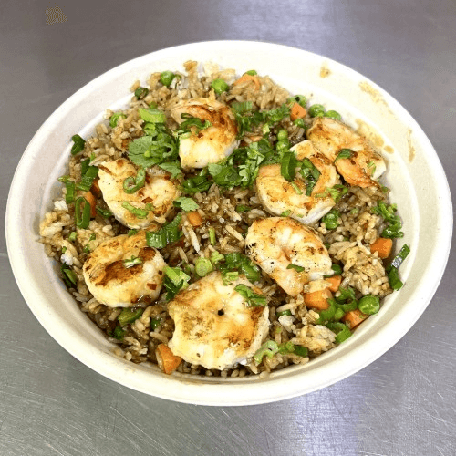 Hibachi Grilled Shrimp Fried Rice stir fry with Pea & Carrot. Topping with Green Onion, Cilantro.