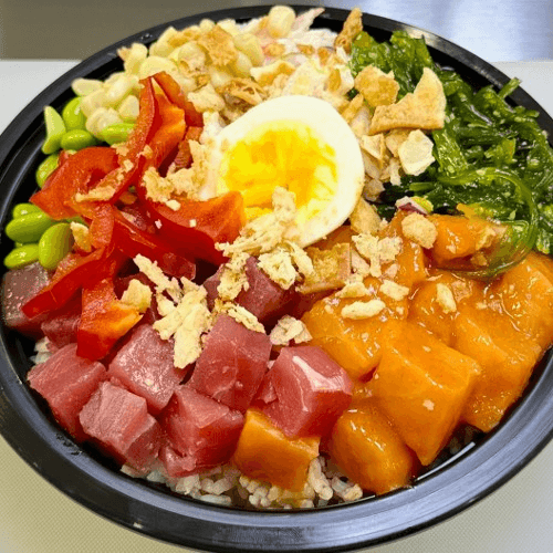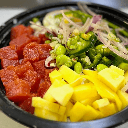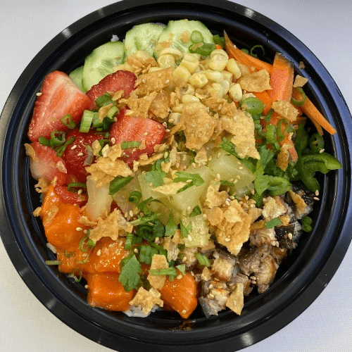 Tuna, salmon, shrimp, Seaweed Salad, Jalapeño, Masago, Cucumber, Green onion, Pineapple, Sesame seed, Spicy ginger Dressing