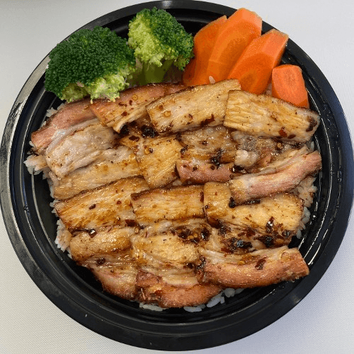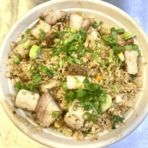 Hibachi Grilled Pork Belly Fried Rice stir fry with Pea & Carrot. Topping with Green Onion, Cilantro.