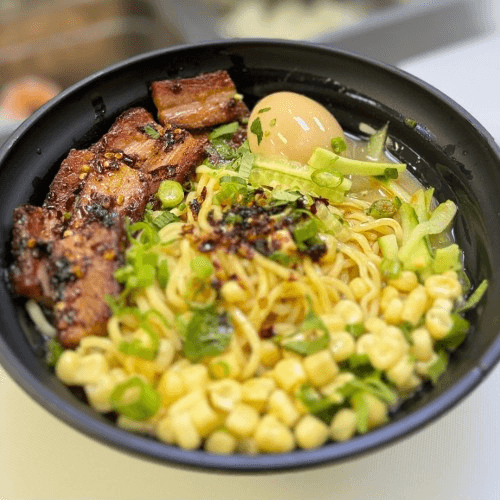 Broth: Spicy Pork Broth Topping: Spicy Grilled Chashu (Pork Belly), Ajitama (Japanese Style Marinated Egg: Cold), Cucumber, Corn, Green Onion, Cilantro, Roasted Sesame Seed