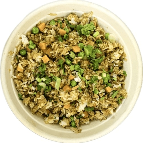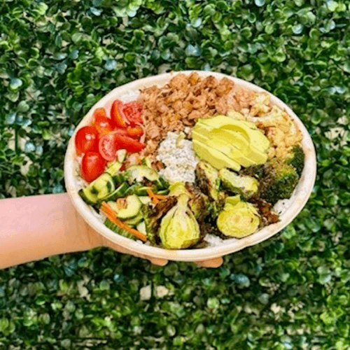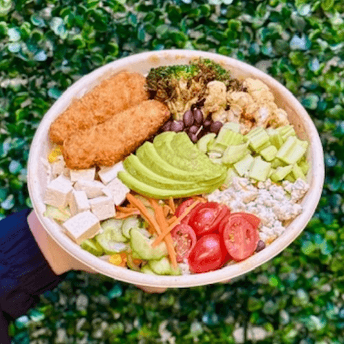 Protein: Plant Based Chicken Tenders Choose Your Base: Jasmine Rice or Fresh Green Mix or Half and Half Veggies: Avocado Slice, Firm Organic Tofu, Marinated Black Beans, Roasted Broccoli, Roasted Cauliflower, Cucumber Namasu, Edamame, Chopped Celery, Cherry Tomato, Blue Cheese Crumble Topping: Onion Crisp Dressing: Sesame Dressing (Served on the side, add a cup to bowl)