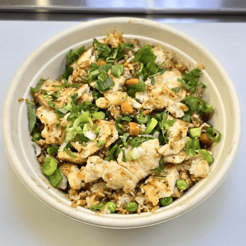Protein: Smoked Fired Chicken Breast (Non-Spicy) Choose Your Base: Jasmine Rice or Fresh Green Mix or Half and Half Veggies: Avocado Sliced, Marinated Cherry Tomatoes, Roasted Cauliflower, Roasted Broccoli, Cucumber Namasu, Blue Cheese Crumbles, Edamame, Fried Brussel sprouts Topping: Wonton Crisp Dressing: Greek Vinaigrette (Served on the side, add a cup to bowl)