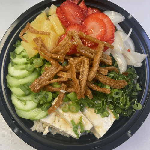 Organic tofu, Cucumber, Edamame, Seaweed Salad, Green Onion, Sweet Onion, Strawberry, Pineapple, Tofu skin, Sweet & Sour Dressing