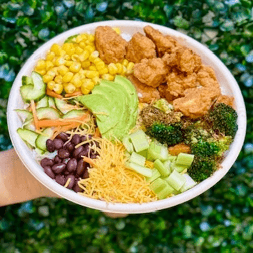 Protein: Classic Crispy Fried Chicken Choose Your Base: Jasmine Rice or Fresh Green Mix or Half and Half Veggies: Avocado Sliced, Marinated Black Beans, Shredded Cheddar Cheese, Cucumber Namasu, Sweet Corn, Chopped Celery, Roasted Broccoli Topping: Onion Crisp Dressing: Smoky BBQ Ranch (Served on the side, add a cup to bowl)