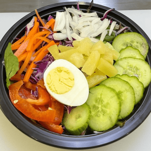 Protein: Fried Edamame Falafel (5 PCS Round Balls) Choose Your Base: Jasmine Rice or Fresh Green Mix or Half and Half Veggies: Marinated Black Beans, Cucumber Namasu, Marinated Cherry Tomato, Sweet Corn, Roasted Cauliflower Topping: Onion Crisp Dressing: Tzatziki Dressing (Served on the side, add cup to bowl)