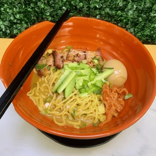 Ramen Noodle Mixes Sichuan Style Hot & Spicy Sauce Feature: Spicy Topping with Chashu (Grilled Spicy Pork Belly- 4 Pieces in Square Size), Shredded cucumber, Shredded Carrot, Red Bell pepper, Green Onion, Cilantro, Roasted Sesame Seed. Notice: Lo Mein is noodle with sauce, it doesn't come with broth.