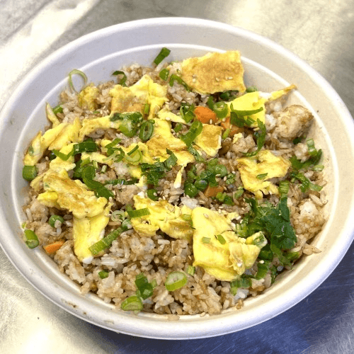 Hibachi Style Fried Rice stir fry with Pea & Carrot. Topping with Green Onion, Cilantro, Roasted Sesame Seed.