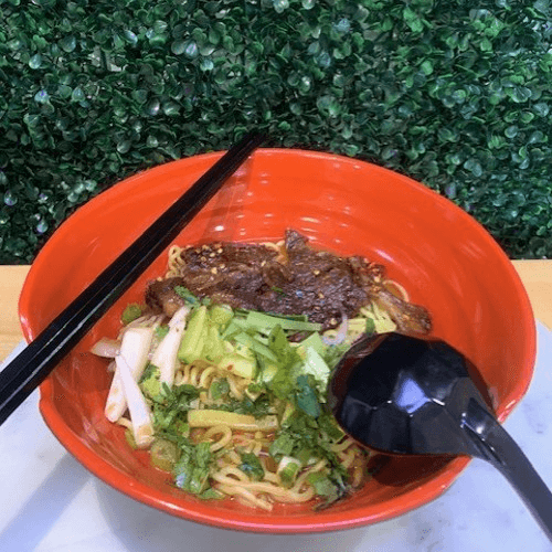 Broth: Chef Special Beef Broth (Rich Beef Broth with Different Asian Spices: Hot) Topping With Beef Short Rib (Spicy non- Bone Beef Short Rib: 4 Pieces- short ribs naturally contains Fat), Red onion, Sweet onion, Green Onion, Cilantro and Sesame Seed. Notice: This Beef Broth Contain Nuts, Please do not order if you have any nuts allergies. This Broth is Medium Spicy/hot.