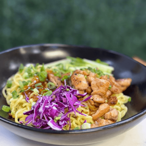 Ramen Noodle Mix Sweet & Savory Sauce Feature: Sweet Topping with Grill Chicken (4 oz), Shredded Cucumber, Red Cabbage, Green Onion, Cilantro and Roasted Sesame Seed Notice: Lo Mein is noodle with sauce, it doesn't come with Broth