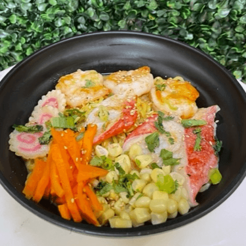 Broth: House Broth Topping: Grilled Shrimp: 3 PCS, Crab Meat: 3 PCS, Fish Flake:3 PCS, Shredded Carrot, Corn, Green Onion, Cilantro, Roasted Sesame Seed